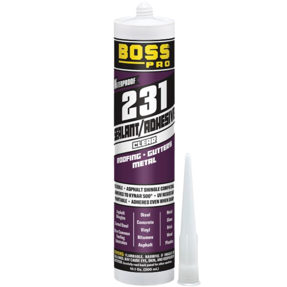 | Description | BOSS 231 CLEAR is a plasto-elastic, paintable, one-component repair sealant based on copolymers, BOSS 231 has excellent adhesion on bitumen, asphalt, hardened concrete, metal, glass, brick, wood and plastics including Kynar 500*. BOSS 231 is also suited for wet, non-absorbing surfaces, and is ideally suited for waterproofing cracks in roofs, gutters, skylights, chimneys, walls, etc. BOSS 231 is resistant to U.V. exposure and temperatures up to 200°F. |