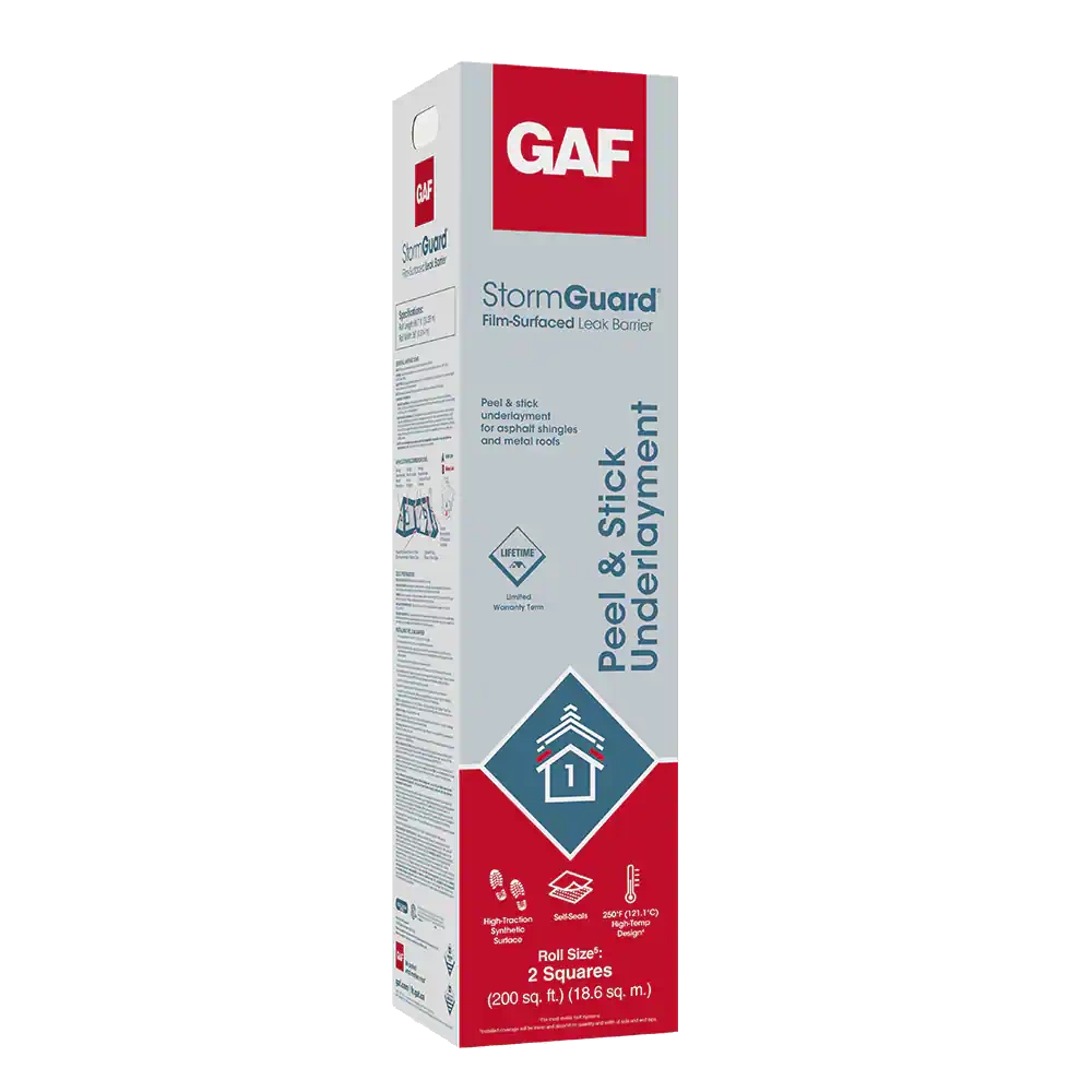 | Description | By creating a barrier at the most vulnerable areas of your asphalt shingle or metal roof (at the eaves and rakes, in valleys, around chimneys, etc.), StormGuard Film-Surfaced Leak Barrier helps prevent leaks due to water backing up in your gutters, wind-driven rain, and in the North, damaging ice dams. |