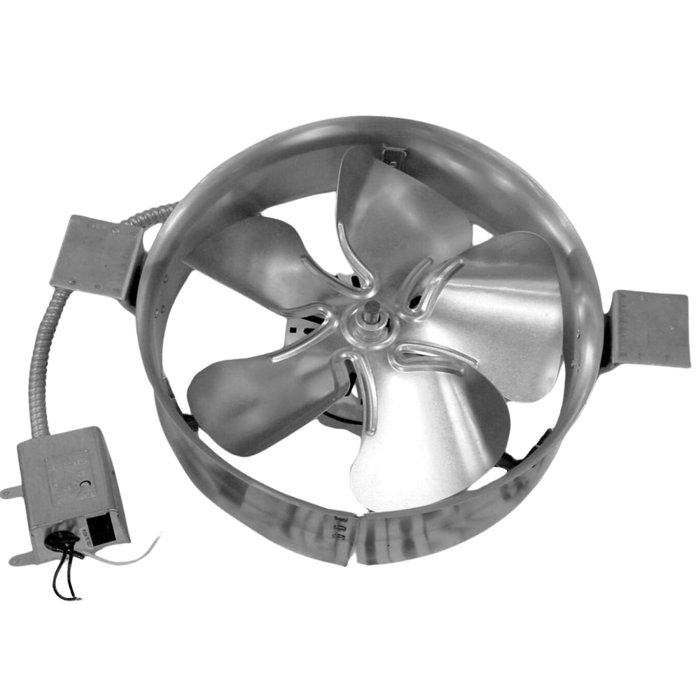 | Description | The Add-a-vent gable ventilator, boasting 5 balanced aluminum blades pitched for smooth operation and high-volume air removal, features a 12" diameter and comes equipped with a factory-set adjustable thermostat. |
