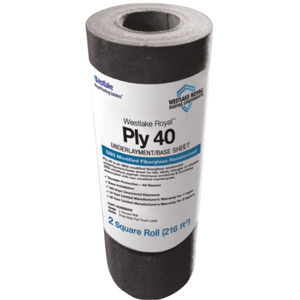 | Description | Westlake Royal Ply 40 is an SBS modified fiberglass reinforced underlayment/ base sheet for tile, shingle or shake. SBS modified asphalt minimizes wrinkling & buckling associated with non modified membranes. |
