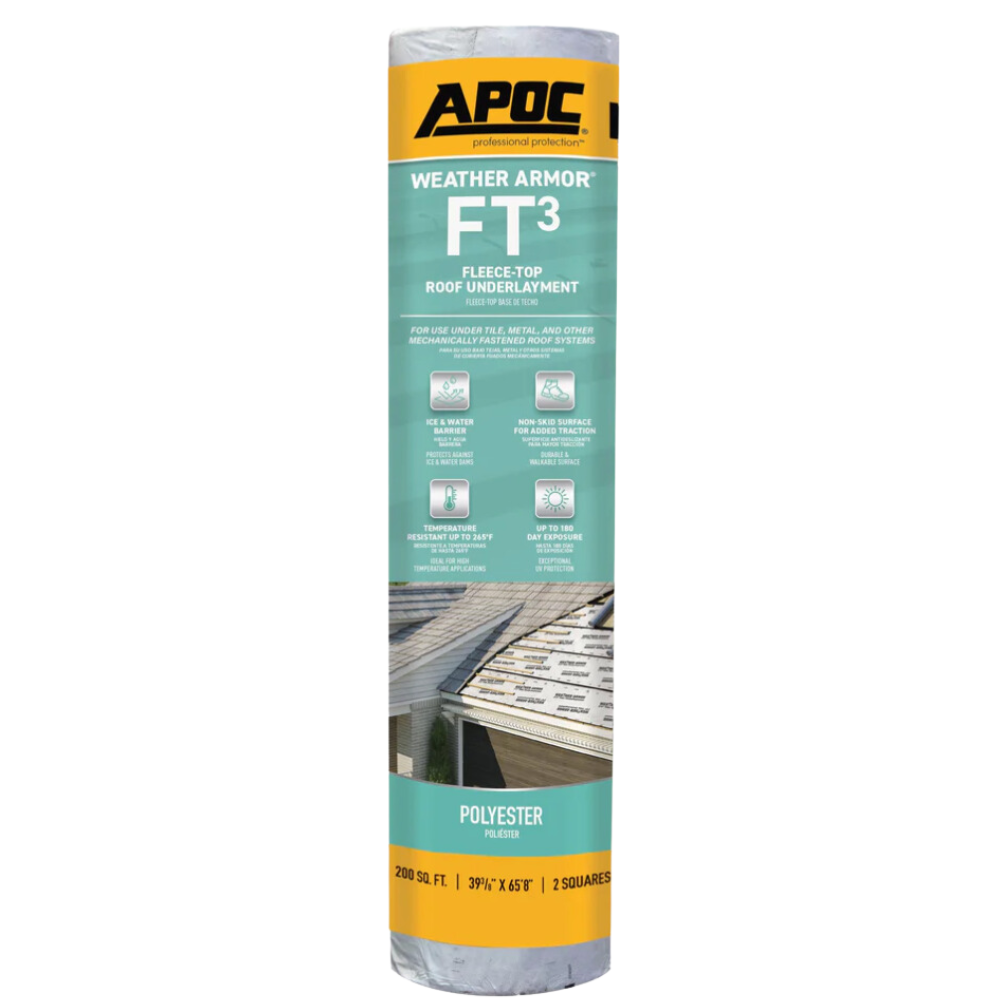 | Description | APOC Weather-Armor FT-3 Fleece-Top underlayment is a state of the art, premium roof underlayment and leak barrier that is ideally suited for tile and metal roofing systems, as well as where conditions require a mechanically fastened roof system. Manufactured with dual reinforcements, heavy weight. |