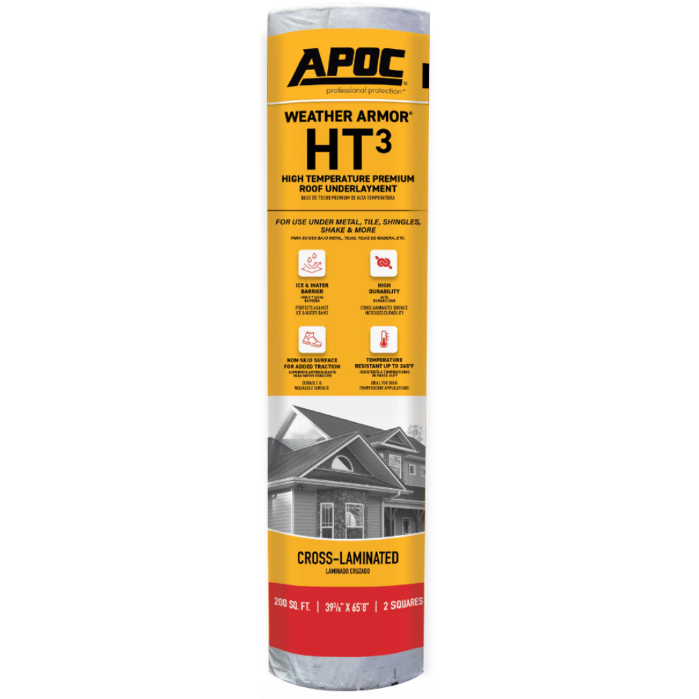 | Description | APOC Weather Armor HT-3 is a state of the art, premium roof underlayment and leak barrier for use under metal, tile, shingle and slate roofing systems. Weather-Armor HT³ is manufactured using high melt bitumen, a high performance cross-laminated polypropylene surface and highly flexible rubber polymers. |