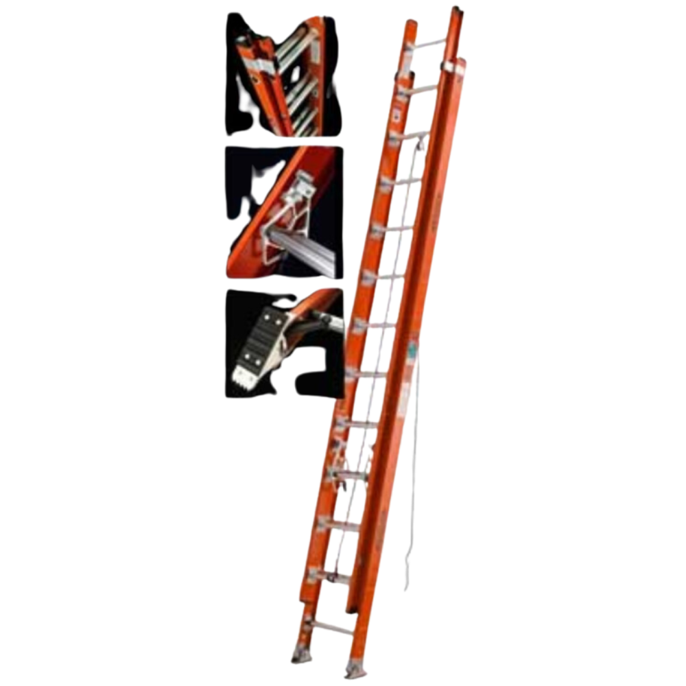| Description | Type 1-A designed with solid fiberglass side rails, nexus-coated to reduce fiber prominence or blooming during years of service. Rungs incorporate a patented "rung to rail" connection. Feature 1-5/8" tempered aluminum flat top rungs, 5/16" polypropylene rope over a 1-1/4" pulley, cast aluminum swivel-type safety shoes with thick rubber tread, and die-cast aluminum, gravity-type rung locks. |
