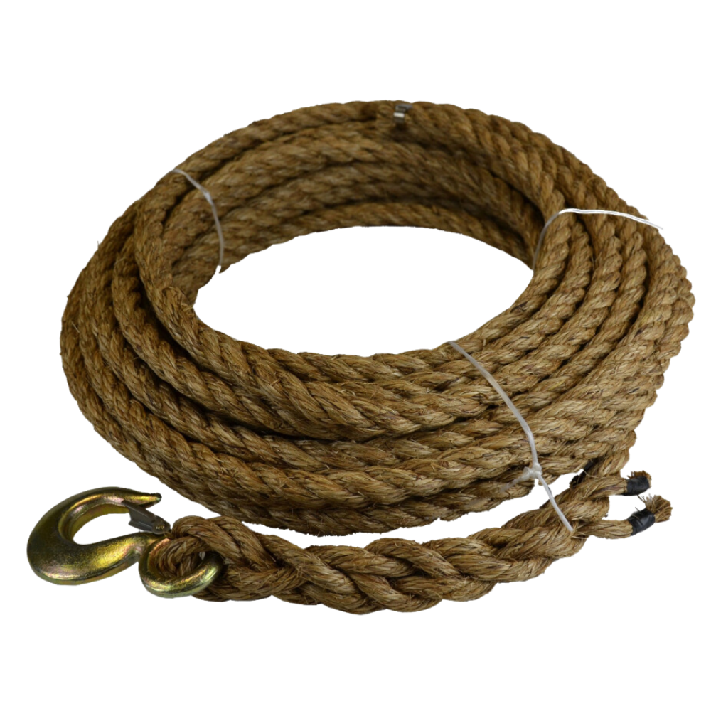 | Description | Durable, strong and flexible, Manila rope is extremely popular in the industrial fields as an excellent all-purpose rope. This rope is larger than necessary for most hoisting operations, but is popular due to the diameter and feel in your hand. This rope is cut to a 100' length and has an O.S.H.A. compliant spliced safety hook attached and a stainless steel band at the opposite end so that it doesn't unravel. NOTE: Manila rope should be kept dry, as moisture deteriorates the strength of the rope. |