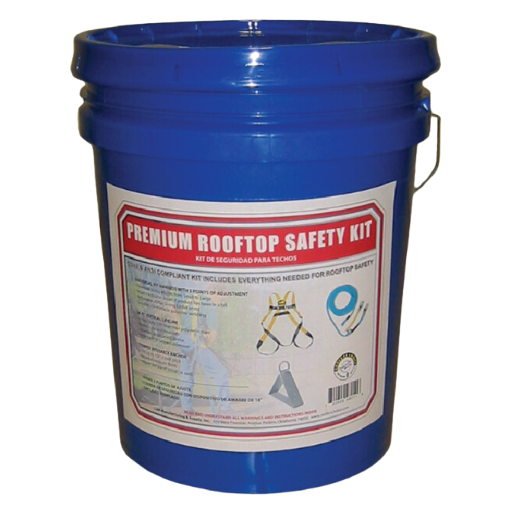 | Description | Full body harness. Heavy-duty 5/8" x 50 ft. blue steel polyolefin rope 3' soft pack lanyard with 5/8" manual rope grab Hinged/re-usable roof peak anchor. |