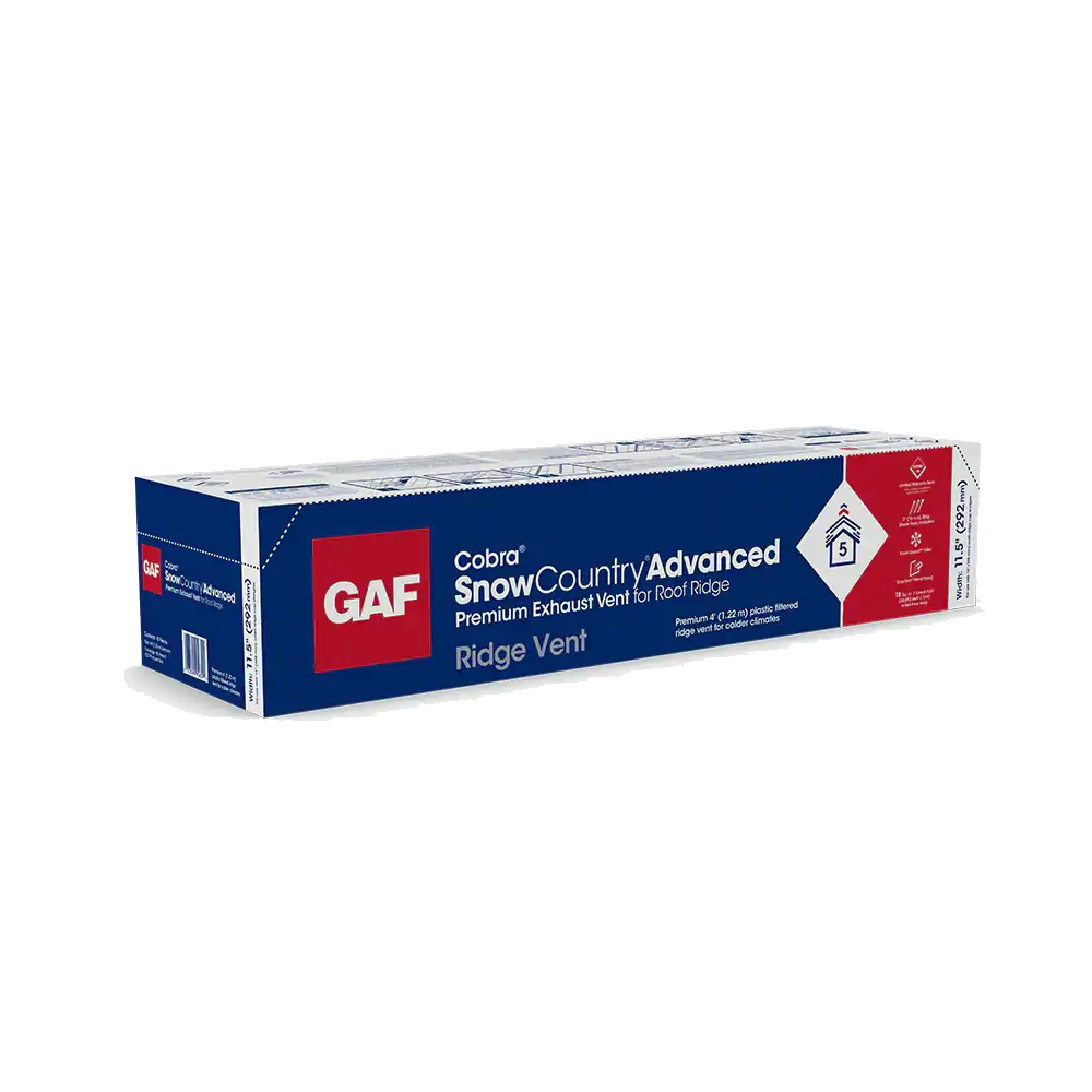 | Description | Cobra SnowCountry Advanced Exhaust Vent for Roof Ridge allows heat and moisture to escape at the ridge while helping to prevent snow infiltration in harsh winter climates. It provides 18 sq. inches per linear foot of net free ventilating area and its unique EasyTear Sizing feature allows you to hand-tear product in 3" (76 mm) increments — no knives necessary and less waste. |