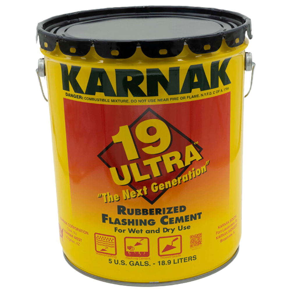 | Description | 19 Ultra Flashing Cement is the next generation elastomeric flashing cement. Scientifically compounded with a selection of rubber reinforced asphalt, mineral fibers, and refined solvents. 19 Ultra is manufactured to a heavy pliable consistency for ease of application by trowel. 19 Ultra provides a durable elastomeric coating of greater strength, excellent adhesion and high resistance to water and weathering. |