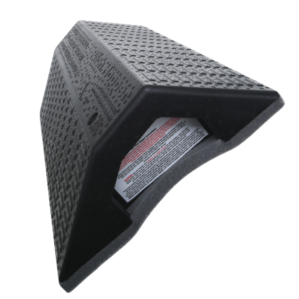 | Description | The Pitch Hopper is designed to allow a temporary working surface on asphalt roof surfaces for roof pitches ranging from 'walking pitch' to 12:12. Our soft foam bottom uses friction force to keep The Pitch Hopper in place, and our unique wedge shape features one side for lower pitch and one steeper pitch allowing for easy usage and maximum comfortability. |