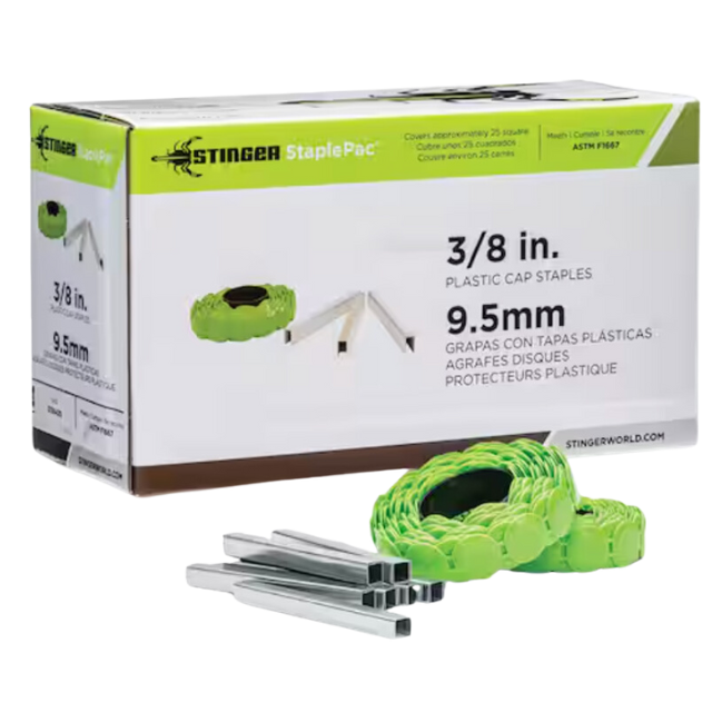 | Description | The Stinger ⅜ in. StaplePac contains 12 rolls of 168 collated plastic caps and 24 strips of 84 staples. |