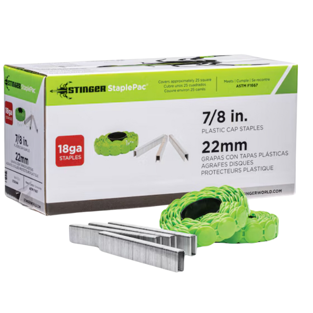 | Description | The Stinger 7/8 in. StaplePac contains 10 rolls of 200 collated plastic caps and 20 strips of 100 staples. StaplePac contains 1 in. collated caps 7/8 in staples. |